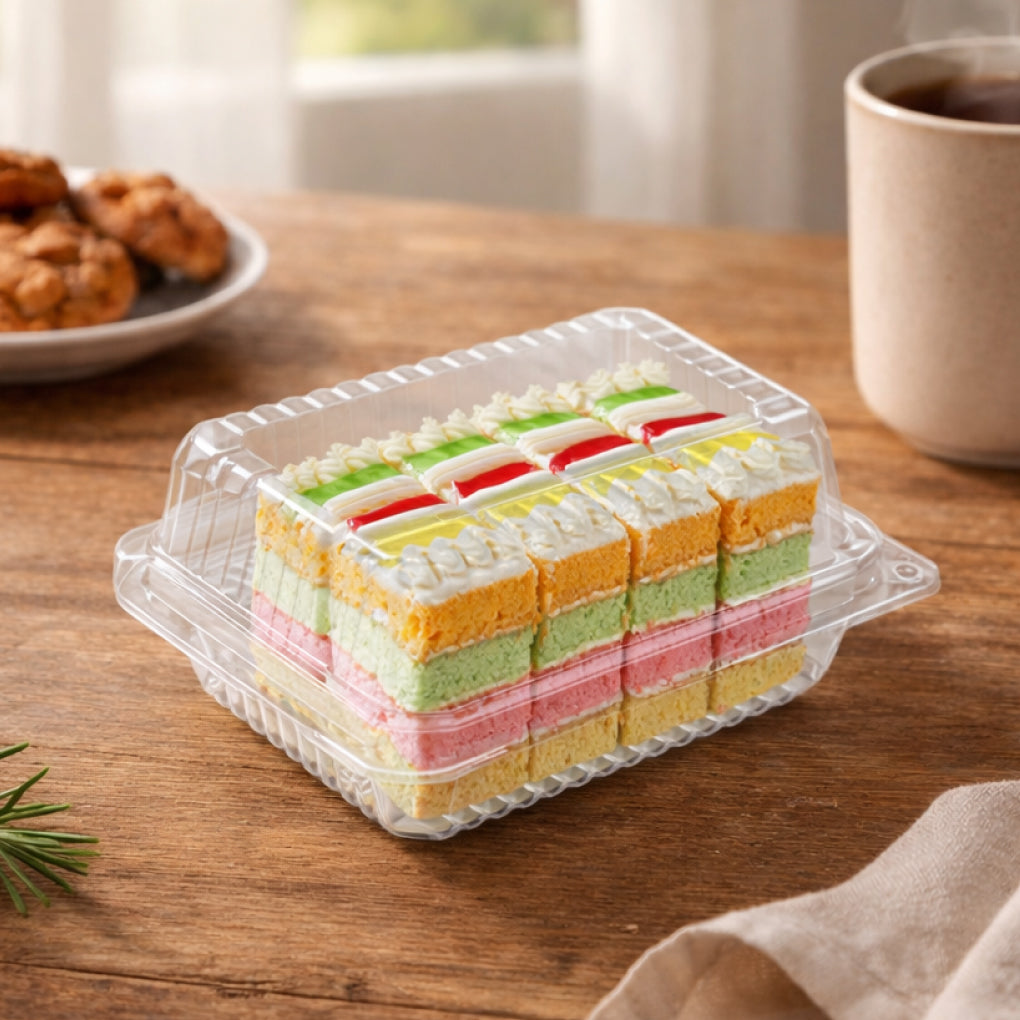 This clear rectangular bakery container (OPS-C46) is designed for bakeries, dessert shops, and F&B businesses that require reliable packaging for takeaway and display.
